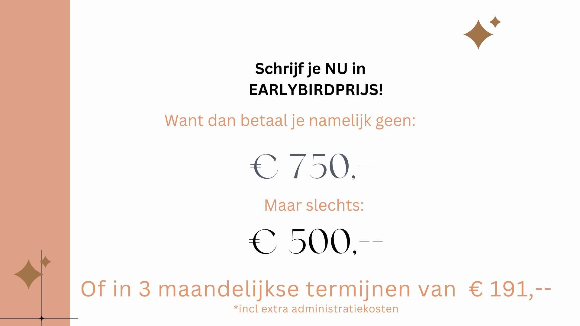 Dan betaal jij maar € 500,-- ipv € 750,-- als je besluit mee te doen aan het eerstvolgende programma