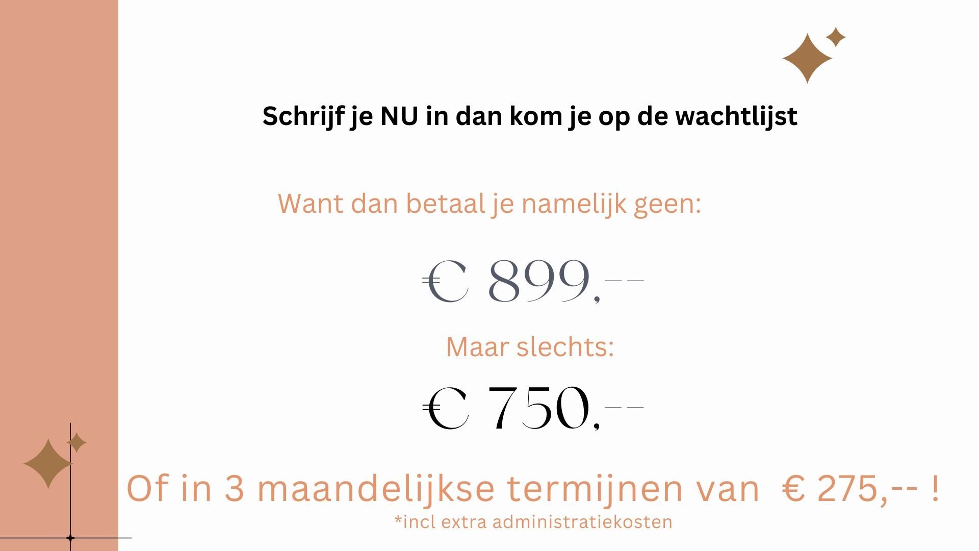 Dan betaal jij maar € 750,-- ipv € 899,-- als je besluit mee te doen aan het eerstvolgende programma